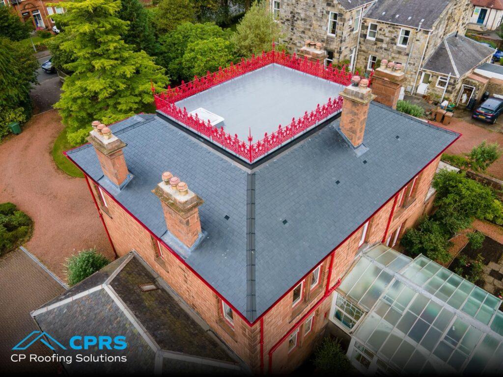 This domestic property in the Galston / Newmilns area required a combination of traditional slate roofing and modern flat roofing solutions. The roof structure consists of multiple pitched slate sections alongside a flat roof area, requiring a carefully coordinated approach to ensure long-term performance and visual consistency.