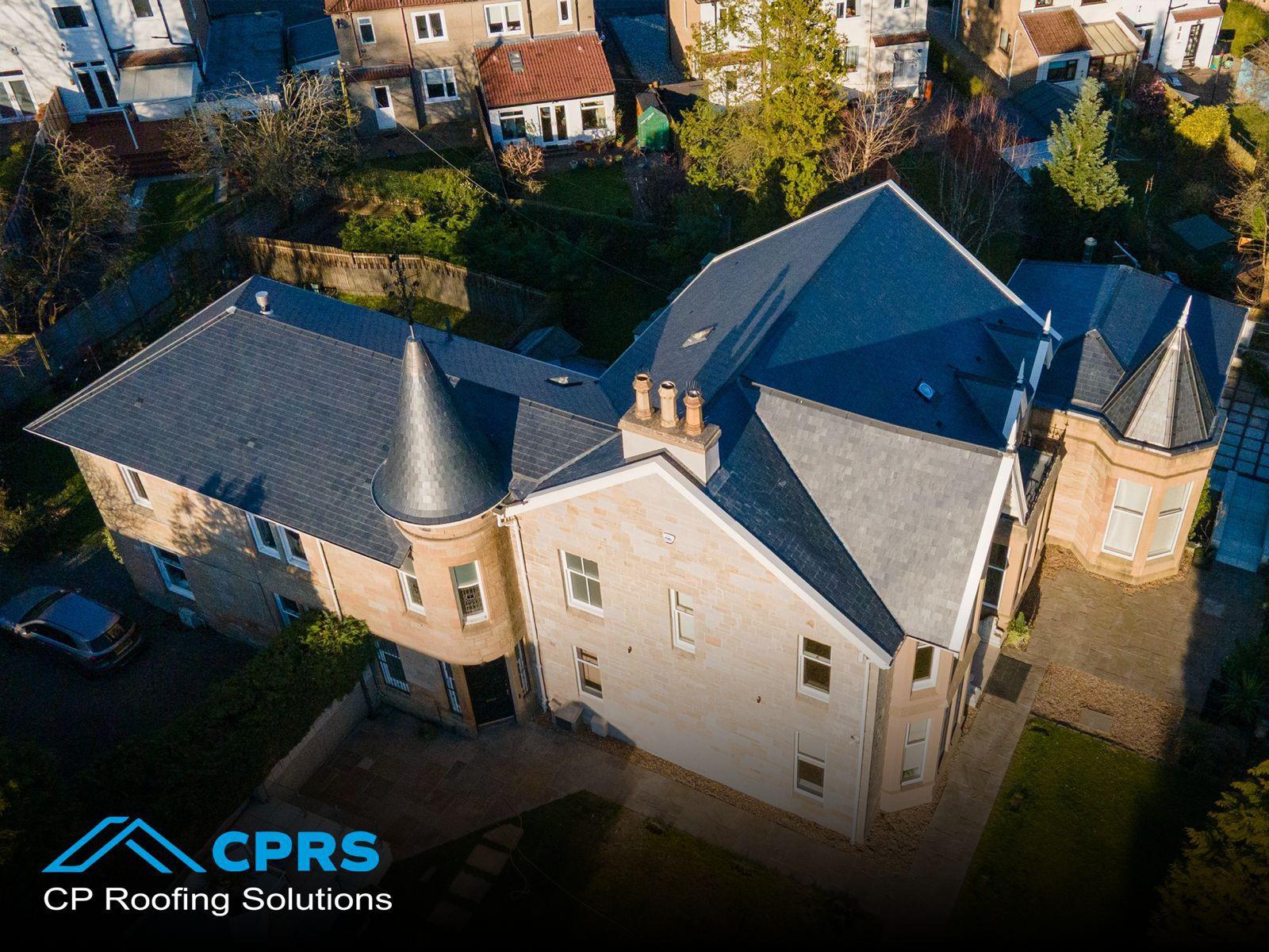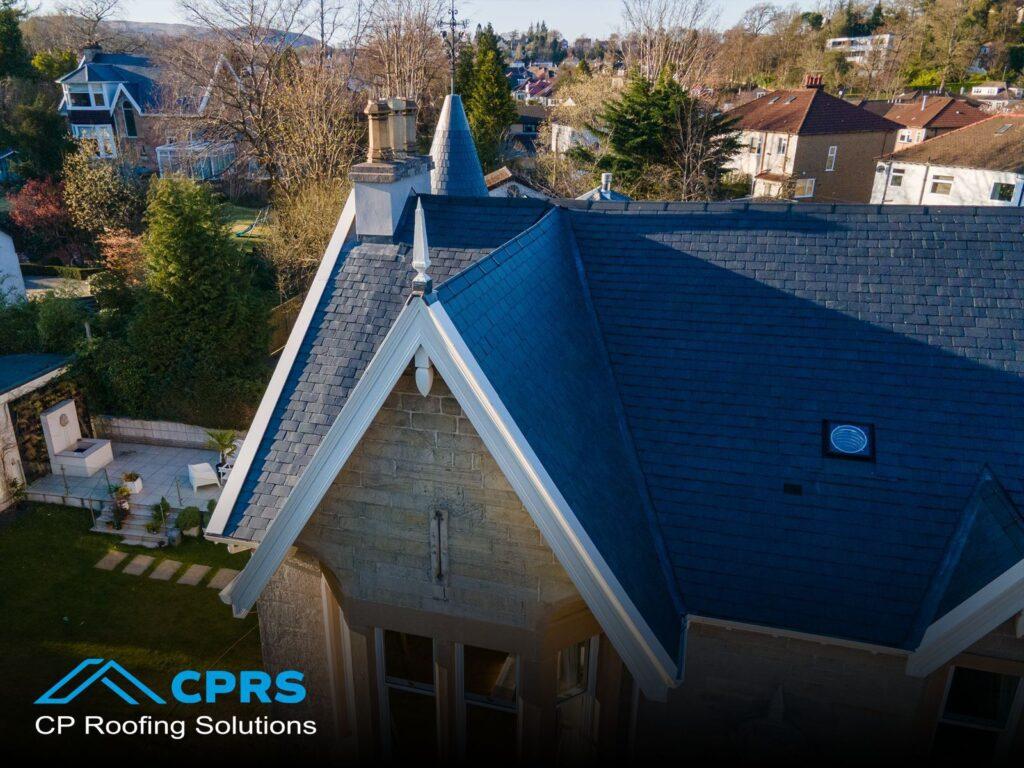 This impressive domestic property on Grange Road, Bearsden features a large, traditional slate roof with multiple roof elevations and a prominent conical turret. Due to the scale and architectural detail of the building, the roofing works required an experienced slate specialist capable of delivering both technical accuracy and a high-quality finish.