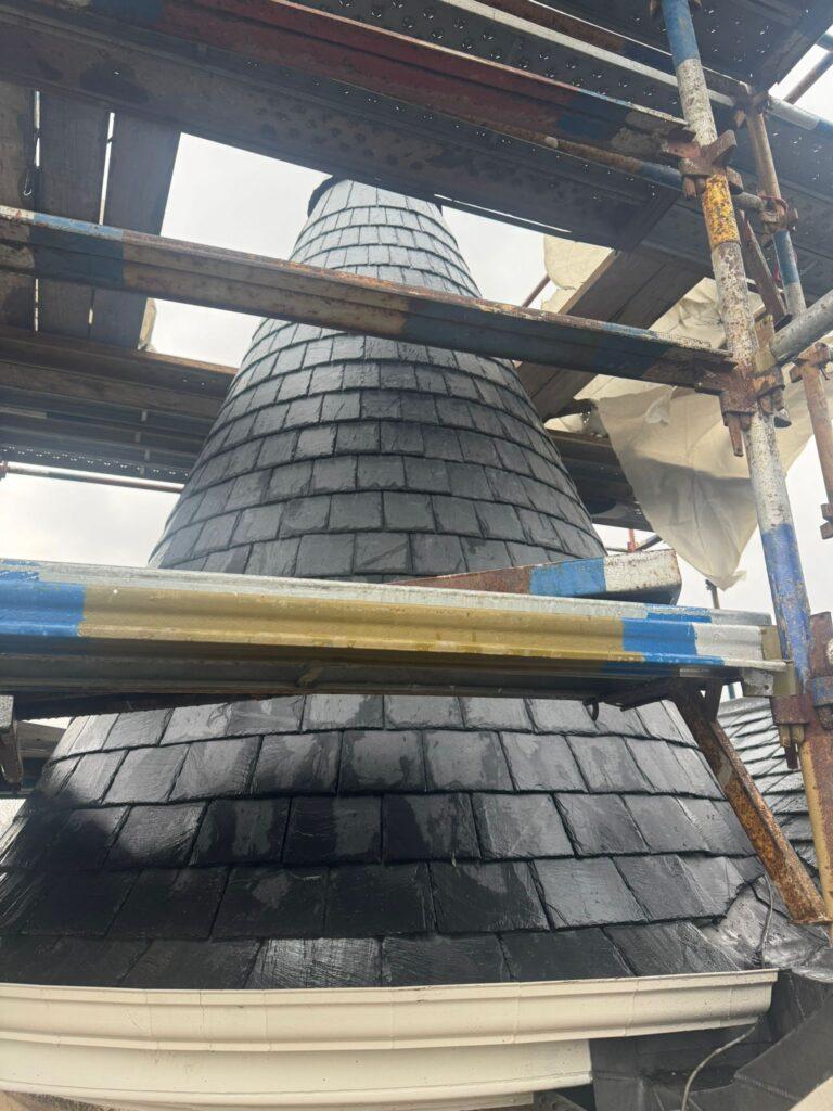 Specialist slate roofing works were completed to the conical turret roof. Due to the curved structure, slates were individually positioned and fixed using traditional techniques to achieve a smooth, uniform finish while maintaining full weather resistance.